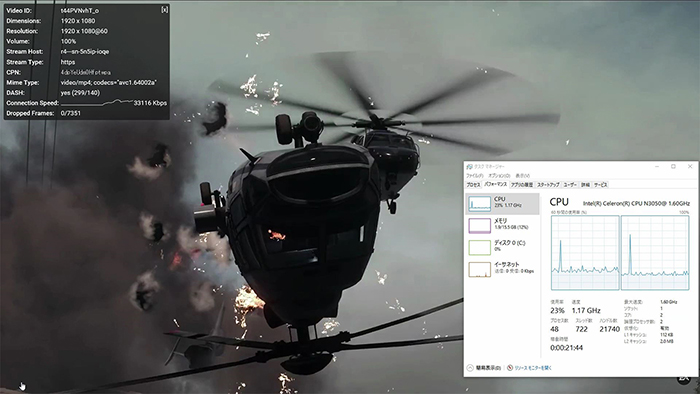 Edgeとの比較ですが、Chromeでの動画再生は非常に重く、ガクガクッとした再生となっています。Edgeの滑らかな再生とは一目してその違いが分かります。Celeron N3050とCeleron N2807ではCPUの処理能力には大きな違いが無いためか、Celeron N2807と同様の結果となってしまいました。CPUパワーの小さいPCでは、Microsoft製ブラウザの方が快適に使用できるようです。最新の技術に対応しながら軽快に動作するEdgeは、ローパワーPCにとって優秀なブラウザであると言えます。
