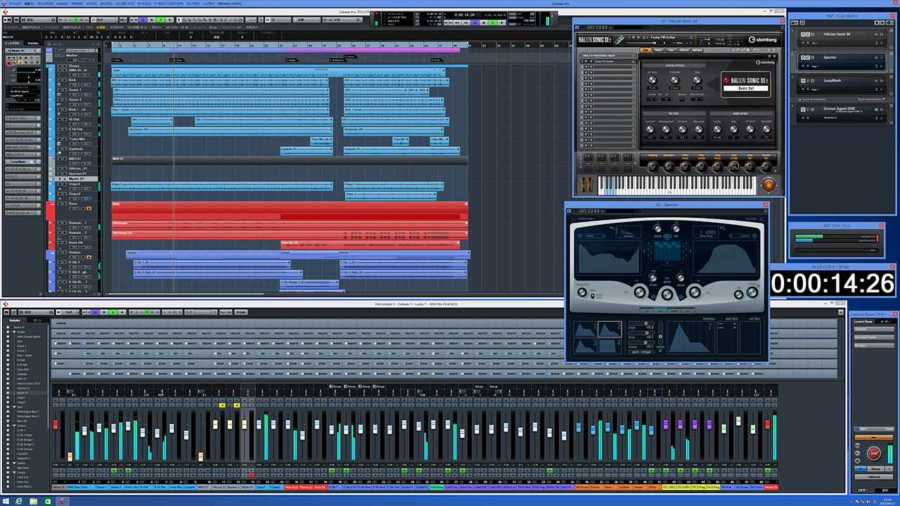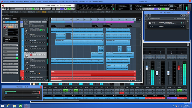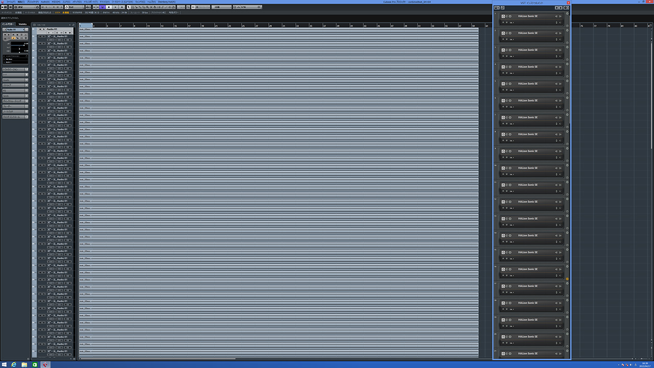 更に情報量が増えました!デフォルト設定ならトラックは46トラックまで一度に表示され、プロジェクトリストや、ミキサーが一望できて非常に扱いやすくなる一方で、VSTプラグインの画面が細かくなりすぎて操作がしづらくなっています。