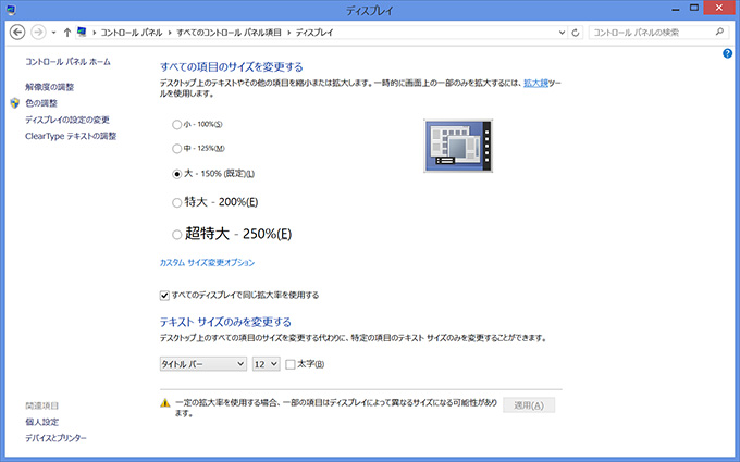 こうした高dpiのモニタを使用する場合には、Windows 8.1の方が柔軟性が高いようですね。
