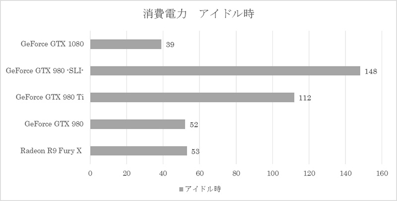 アイドル時でも GeForce GTX 1080 が最小電力となっています。50Wを超えるGeForce GTX 980 に対して GeForce GTX 1080 は40W以下となっており、アイドル時でもGeForce GTX 1080 の省電力性の高さが証明されました。