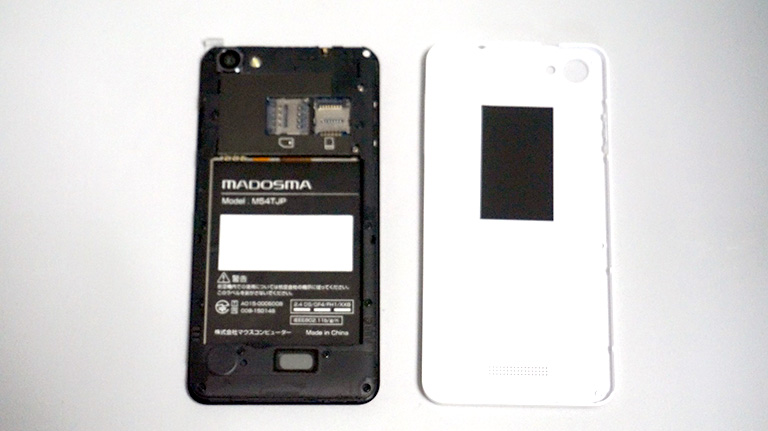 これより本体にバッテリー、SIMカード、microSDカードをセットします。MADOSMAは外部にカード挿入口がありませんので、一度本体カバー(裏ぶた)を取り外して内部のスロットに装着します。