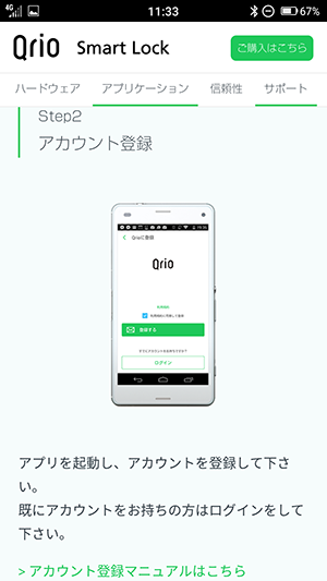 アプリのダウンロードはQrioのサイトから行います。リファレンスガイドにQRコードが印刷されており、こちらを読ませることでスタートアップガイドのページへ移動することが出来ます。こちらにアプリダウンロード用のリンクが設けられています。