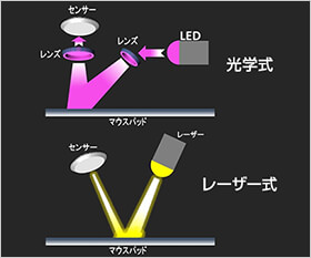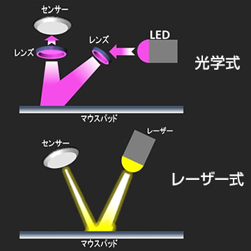 「光学式」は短いリフトオフディスタンスとセンサーの追随性能の高さ、比較的マウスパッドを選ばないのが特徴です。「レーザー式」は、レーザー光の特性から感度・読取精度と解像度が優れていますが、マウスパッドによっては性能が低下します。