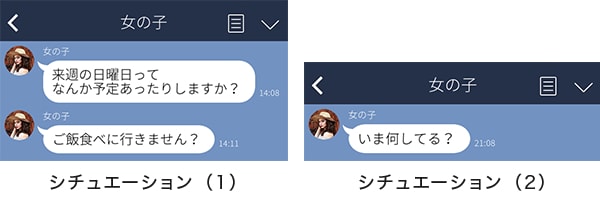 協力者のおじさん1名、女の子1名に次の2つのシチュエーションで送るLINEの文章を考えてもらいました。また、協力者の2人にはこの実験の意図を伝えていない状態でお願いしました。