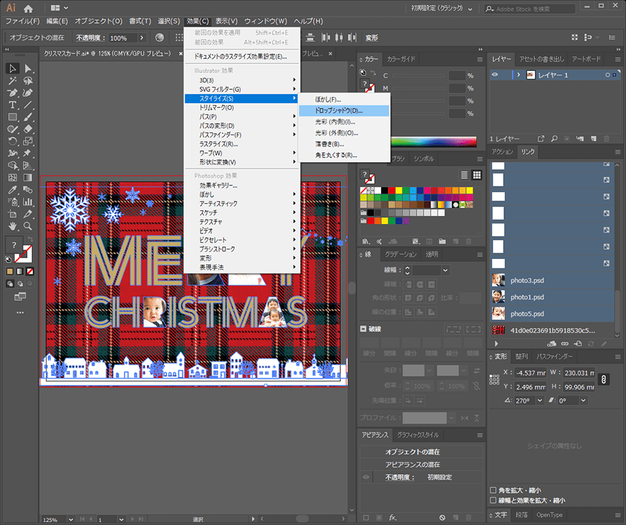 背景以外を選択したら「効果>スタイライズ>ドロップシャドウ」を選択します。