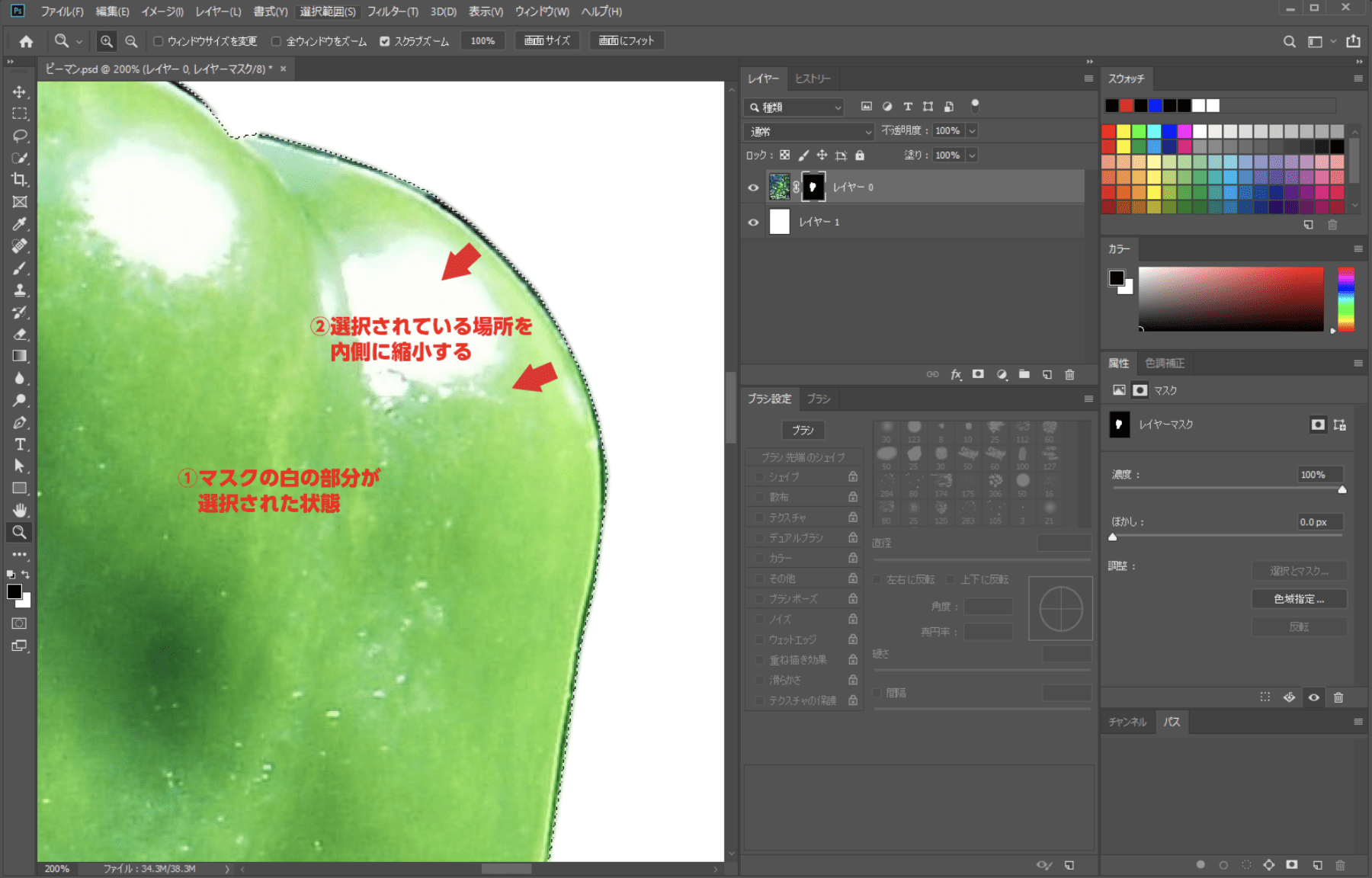 中島さん「ここで、切り抜きたいピーマンのエッジと同じくらいの線がかけるように、試し書きをしながらブラシの設定を調整しましょう。この時に、レイヤーマスクが選択されていること、描画色が黒になっていることを確認してください。」
