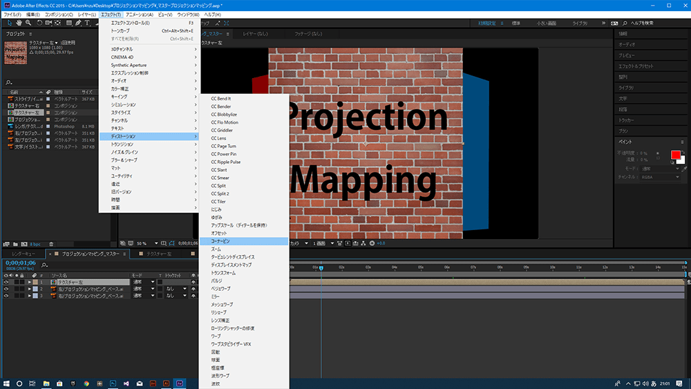 例えば「テクスチャー左」のコンポジションの「文字」テクスチャーの透明度や「レンガ」テクスチャーのカラーやトーンカーブなどを時間経過で変化させればマッピングした状態をあまり気にせずアニメーションを作成することができます。