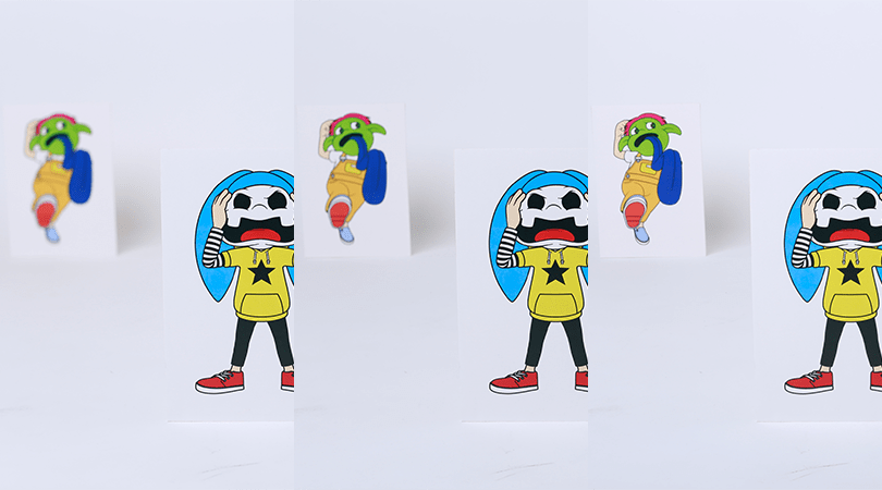 安藤さん「3枚の写真を比較してみると、絞り値が小さくなるほど被写界深度が浅くなり、背景がボケていくことがわかる。50mmの標準レンスの場合、3体すべてのキャラクターをはっきり写すには、F16まで絞りを狭くする必要があるね」