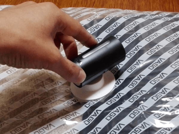 実際に付属している専用の真空バッグ(圧縮袋)Mサイズにセーターとダウンジャケットを入れて、モバイルバッテリーで給電しながら圧縮してみました。