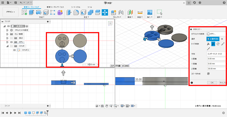 位置を修正する場合には、右クリックし、「移動/コピー」を選び、移動させたいスケッチを選択し、矢印をドラッグするか移動させたい数値を入力します。