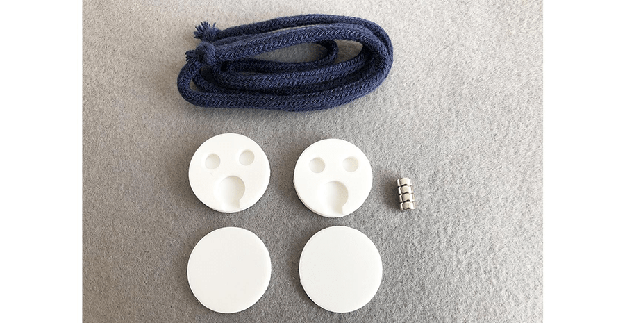 3Dプリンターで出力したら、5mmの紐と磁石を用意します。