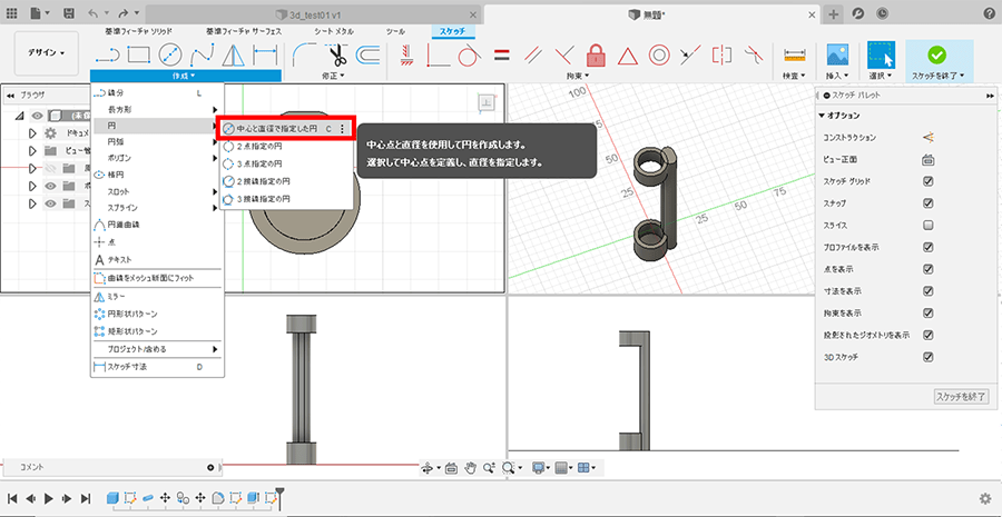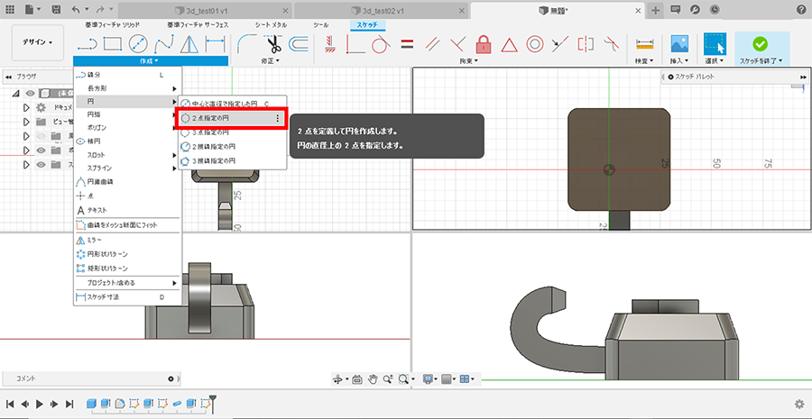 「作成▼ > 円 > 2点指定の円」を選択し、パイプの外径に合わせて円を描画し、「スケッチを終了」を押下します。