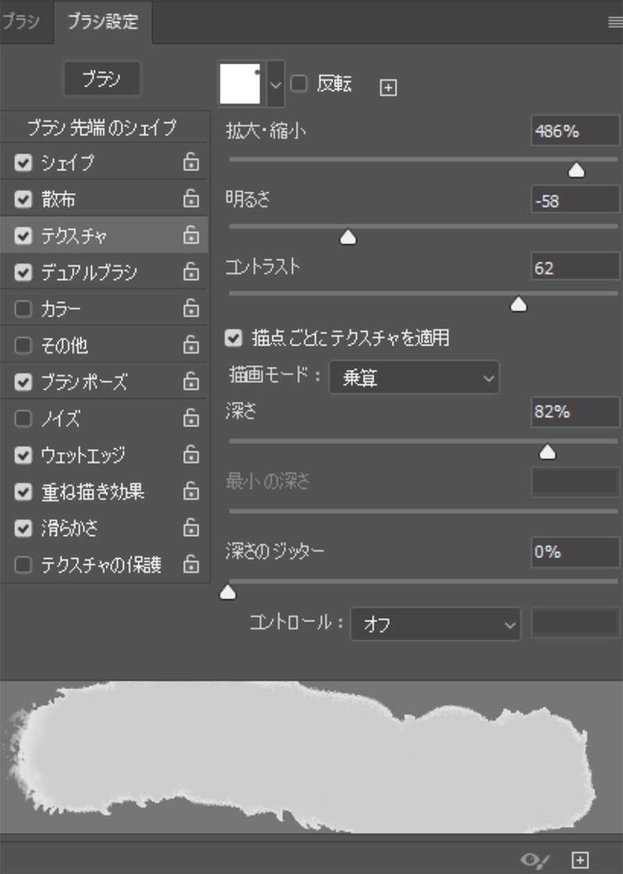 「ブラシ設定」パネルを開いたら、下図のように「シェイプ」「散布」「テクスチャ」「デュアルブラシ」「ブラシポーズ」を調整します。