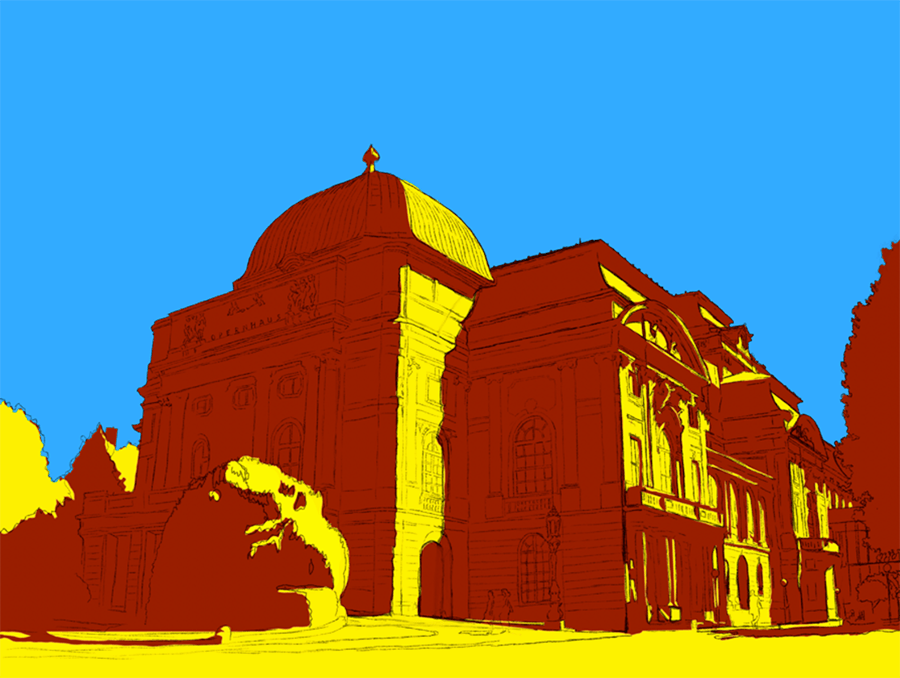 まず今回の対象となる写真を用意します。筆者が撮影した、オーストリアのウィーン国立歌劇場の外観写真です。元写真は、全体に彩度が低くほとんどが影に入っている中、逆光や横からの光が絵となりそうです。