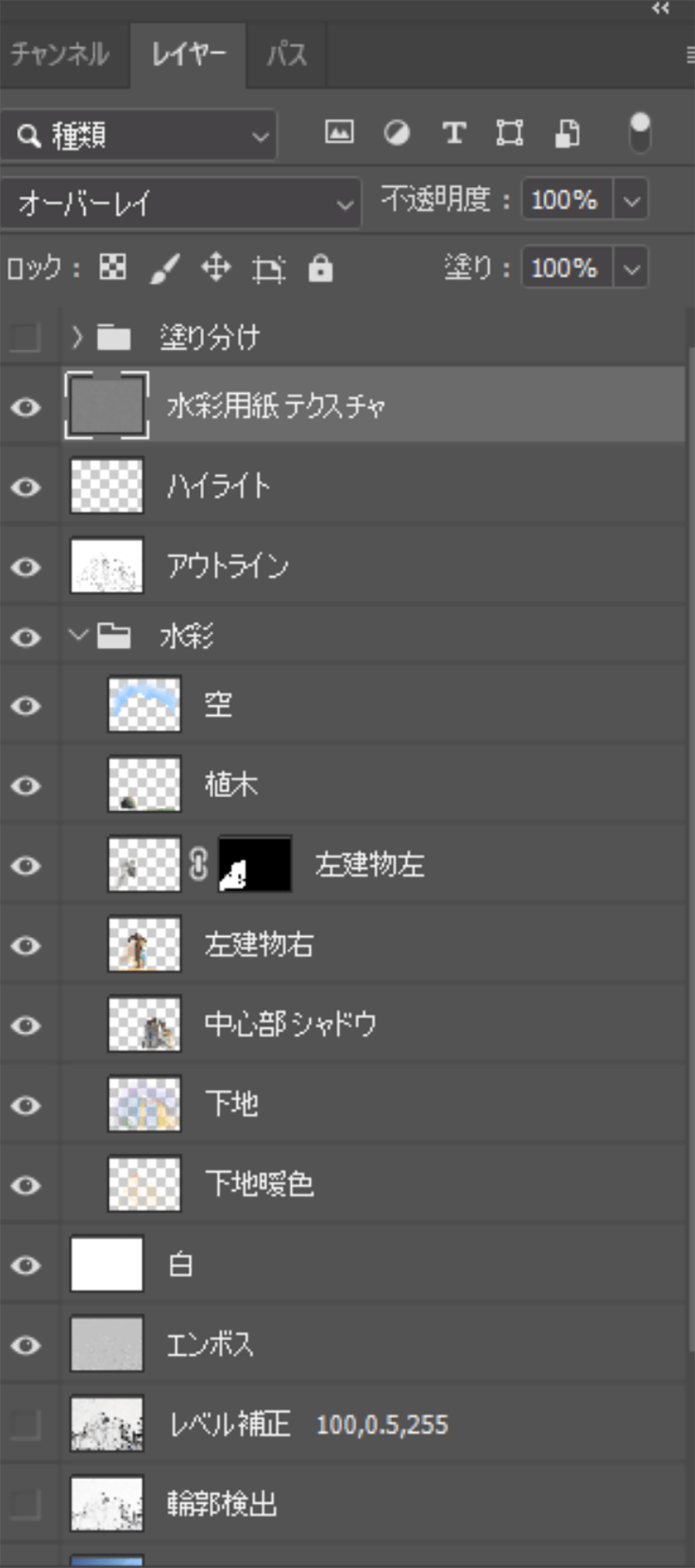 着彩を一通り終えたら、水彩紙のエンボス感を付けるための新規レイヤー「水彩用紙テクスチャ」を一番上に作ります。