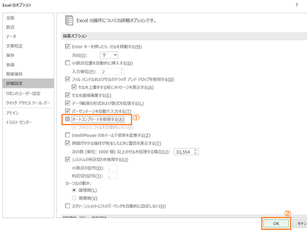 4.編集オプションの「オートコンプリートを使用する」のチェックを外し、「OK」をクリックします。