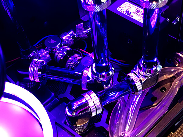 なので、冷却水だけでなく、搭載するファンもすべて紫に光るように注文時にオーダーをしています。