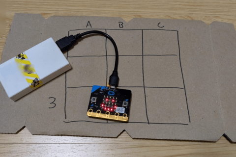 micro:bitのBボタンのあたりをマス目に当てながら、磁石がどこに仕かけられているかを探りましょう! 友だち同士、親子など、一緒に遊ぶ相手に磁石をマス目の裏側に仕かけてもらい、磁石(お宝)の場所を探りあてるゲームで遊んでみてください。