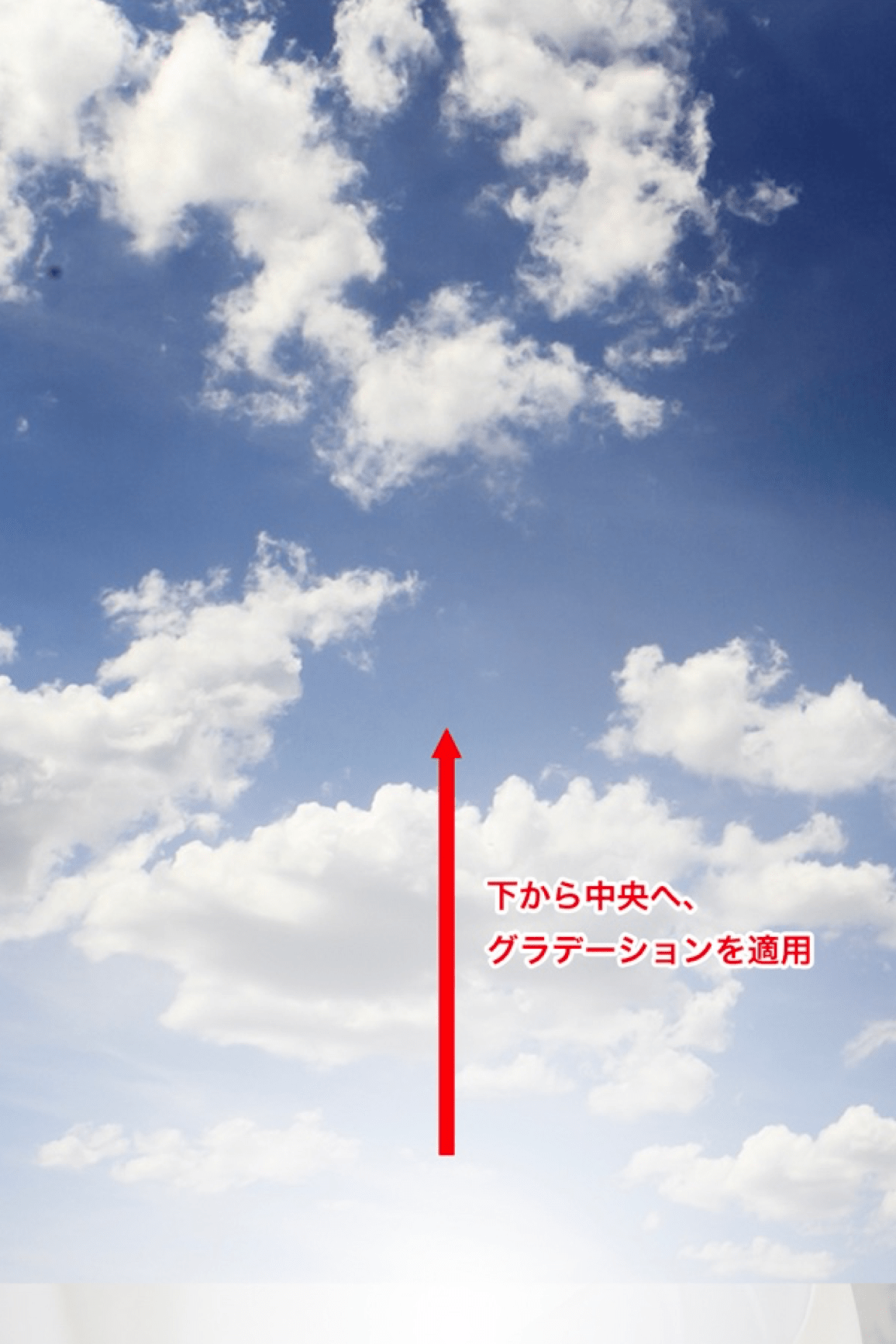 空の画像は印象主義の光に満ちた背景にするため、画像の上に新規レイヤーを作り、ツールパレットの「グラデーションツール」を選択し、下から中心にかけて白から透明の「円形グラデーション」を適用します。