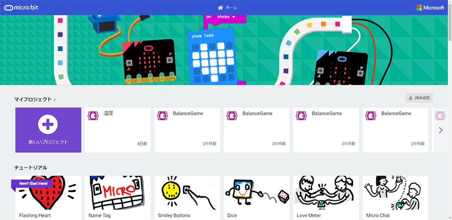 すると、プロジェクトページが表示されます。ここで新しいプロジェクトを作って、 micro:bitを動かすプログラムファイルを作ることができます。