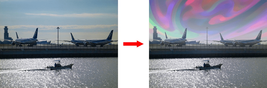 例えば、もう少し雲のある空に変えてみましょう。従来だと、マスク処理で新しい空の写真を合成していましたが、細部のマスキング処理には高いスキルが求められ少々面倒な作業でした。「空を置き換え」機能を使えば、簡単なクリック作業で実行できます。