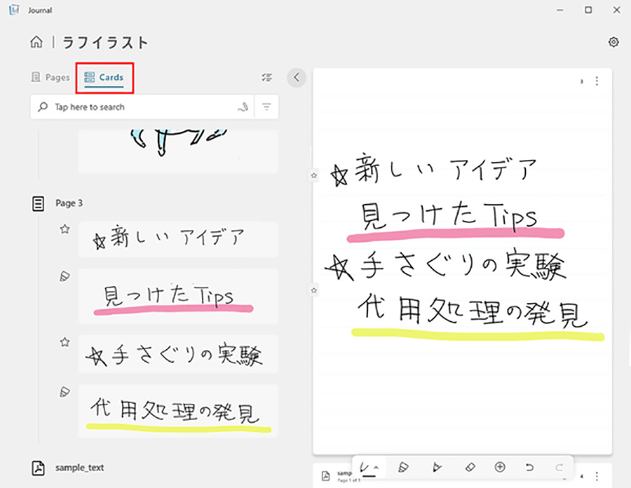 他にも、ちょっとした気が利く機能があります。メモ書きに手書きの星印を文頭に付けたり、マーカー処理した状態で「Cards」を選択してみてください。
