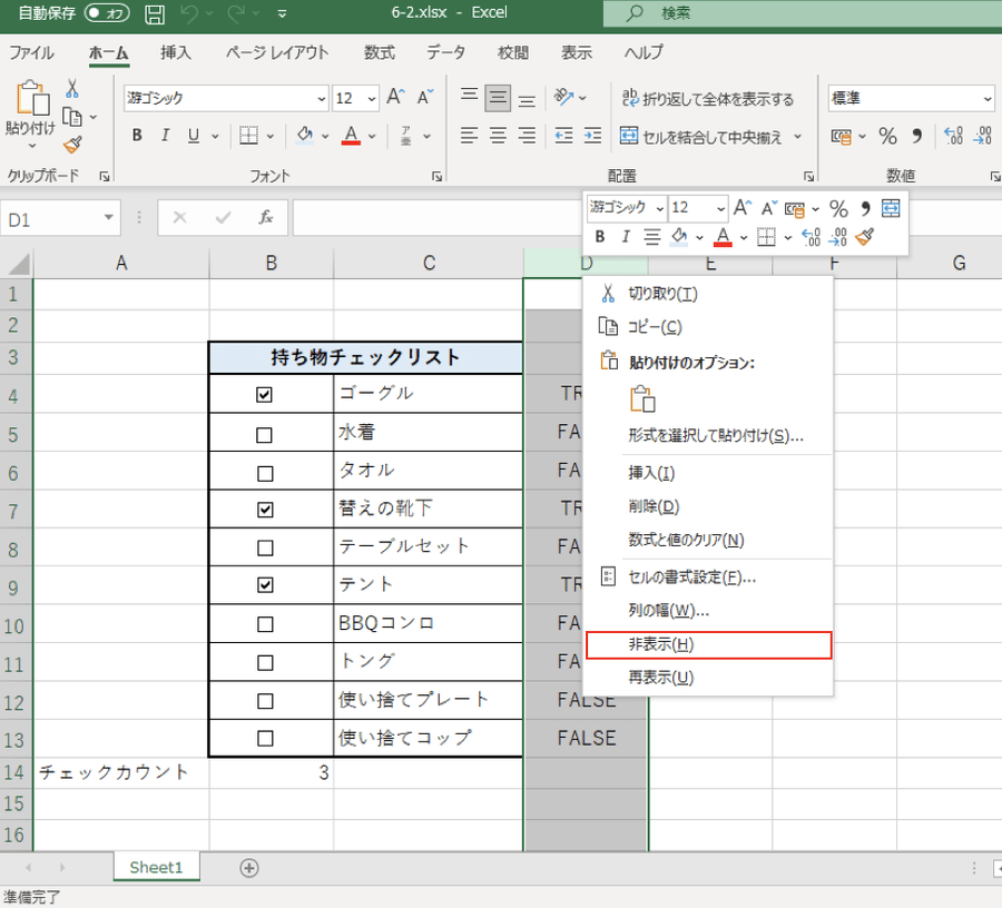 列選択をし終えたら、列上で右クリックして右クリックメニューを表示させ、[非表示]をクリックして列ごと非表示にしておくといいでしょう。