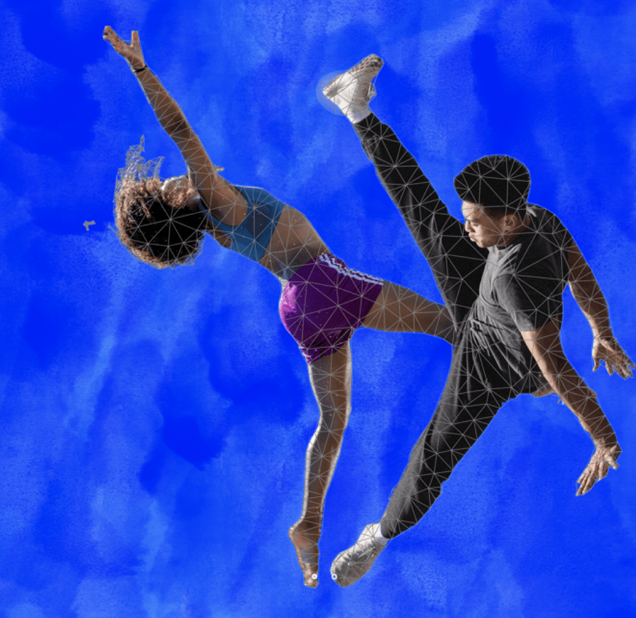 女性と男性が空中でダンスをしている場面を想定し、背景にはシャガール・ブルーが広がるようにします。