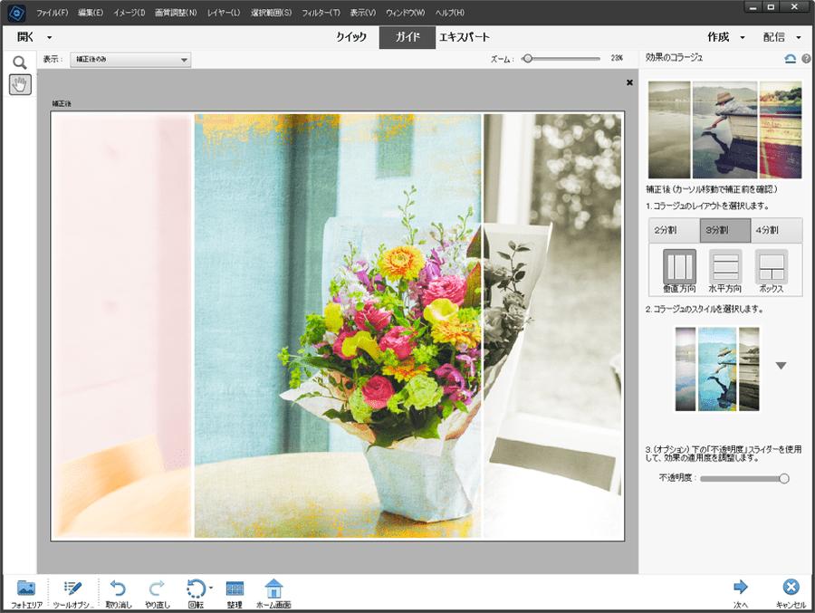 「写真の編集」は、すでに「エキスパート」に触れましたが、他にも前バージョンと名称も同様の「クイック」「ガイド」を含めた3つの編集モードが用意されています。UI上部のタブでモードの切り替えが可能です。