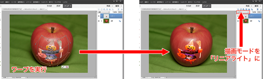 ワープモードでは、対象範囲に対して垂直線4本と水平線4本、4隅のハンドルで構成されるので、ここではリンゴに合わせて変形。作業完了後、チェックマークをクリックして確定し、画像に合わせてレイヤーの描画モードも変更します。ここでは「リニアライト」に設定しました。