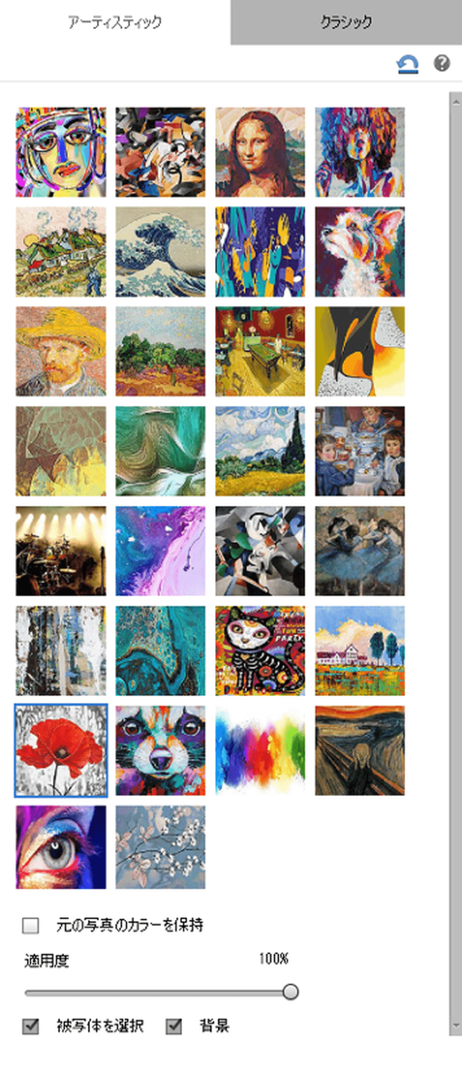 30種類の「アーティスティック」効果の一覧が表示されます。