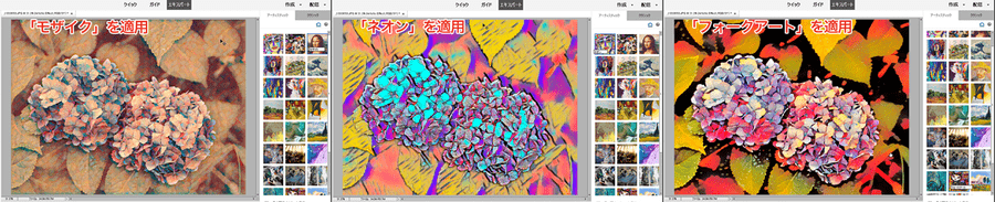 後は、処理したいイメージの効果アイコンをクリックするだけで完了です。元画像を活かしたユニークな絵作りに便利な機能です。以下が左から「モザイク」「ネオン」「フォークアート」を適用したサンプルです。