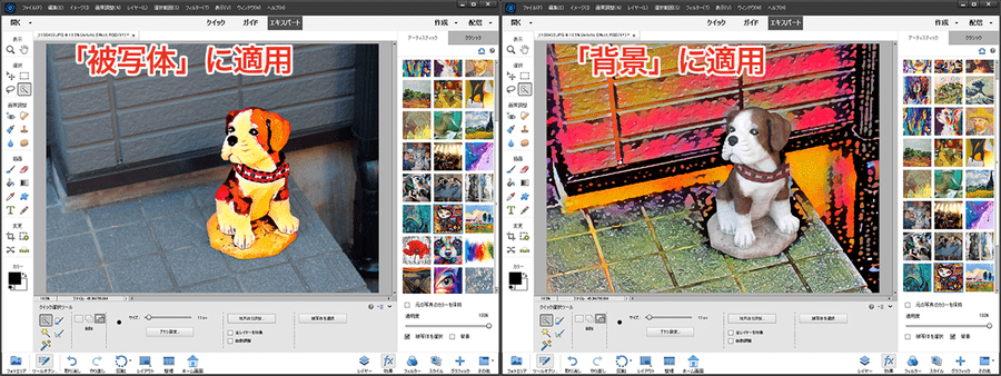 また、メニューバーより「選択範囲」→「被写体」(もしくは右ペイン下の「被写体」にチェック)で被写体だけに、もしくは「選択範囲」→「選択範囲の反転」(もしくは右ペイン下の「背景」にチェック)によって背景部分だけに処理を適用させることもできます。
