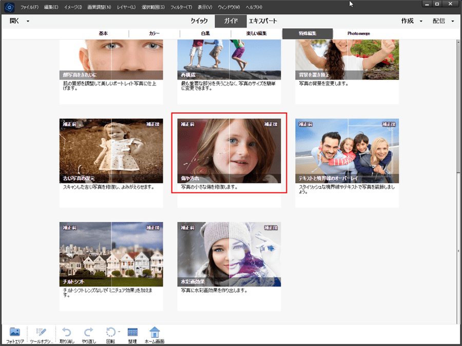 「エキスパート」は、Photoshop Elementsの上位バージョンであるPhotoshopのように利用できるUIで、Photoshop Elements内のすべてのツール群を使用して画像編集および補正が可能となります。また、画像補正環境だけでなく照明やカラーを補正するコマンド、画像のしみや斑点の補正、選択範囲の指定、テキストの追加など描画に必要なツールも用意されています。