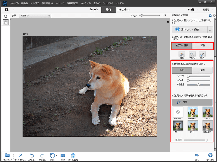 処理が完了し、必要であれば「被写体を選択」でペットを選択し、「照明」や「効果」などで適宜調整も可能です。