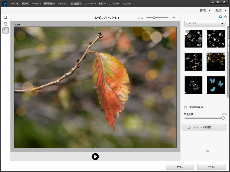 「ムービングオーバーレイ」は、雪の結晶やきらめきなどの動きのあるオーバーレイを追加できる機能です。「エキスパート」モードでソース画像を開き、メニューバーの「画像調整」→「ムービングオーバーレイ」を選択します。