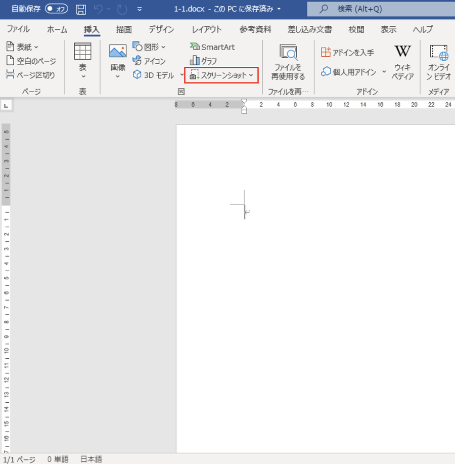 スクリーンショットを挿入するには、まず「挿入」タブをクリックします。