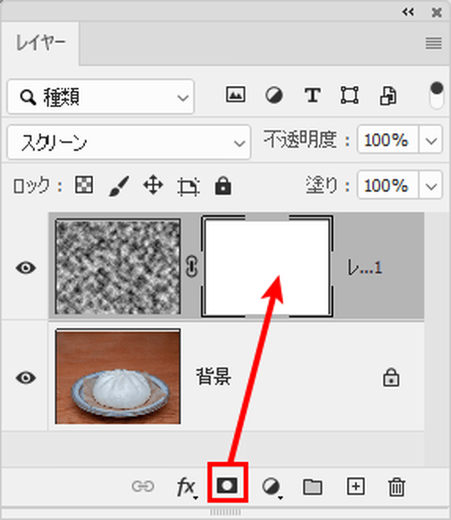 ここで「雲模様1」レイヤーにレイヤーマスクを作成します。レイヤーパネルの下から「レイヤーマスクを追加」をクリック。これを湯気として活用します。