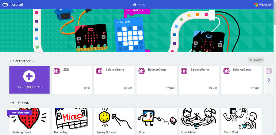 micro:bitのWebサイトにアクセスすると、プロジェクトページが表示されます。
