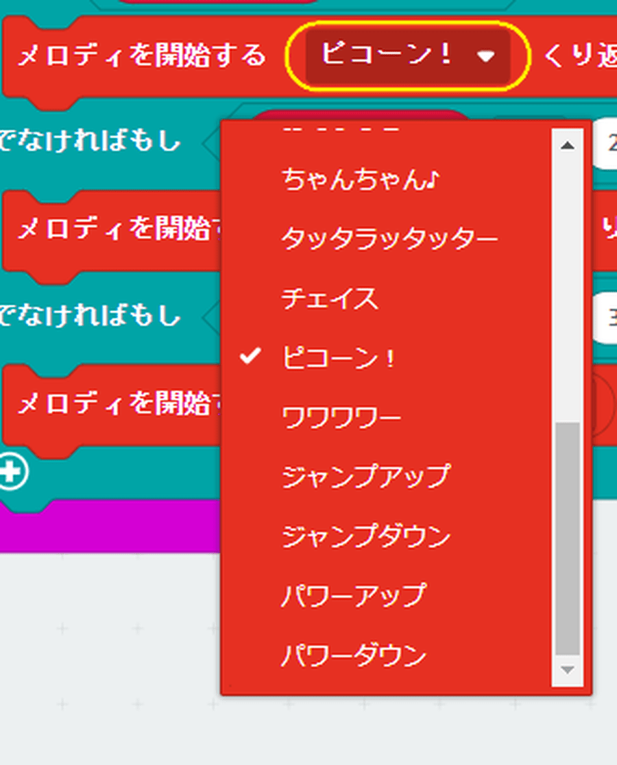 このメロディのブロックでは、「ピコーン!」の他にもいろいろな音を設定できます。1か2か3の時に、それぞれ別々の音を設定していきます。