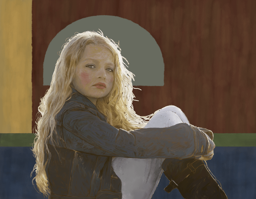 少女について、1番上に新規レイヤーを設けて、影の部分に寒色系の青色要素を、ダウンロードしたブラシツールの中から「印象派塗」と名づけたブラシを選び、描いていきます。紅潮した頬の表現も同じレイヤーで行い、調整します。