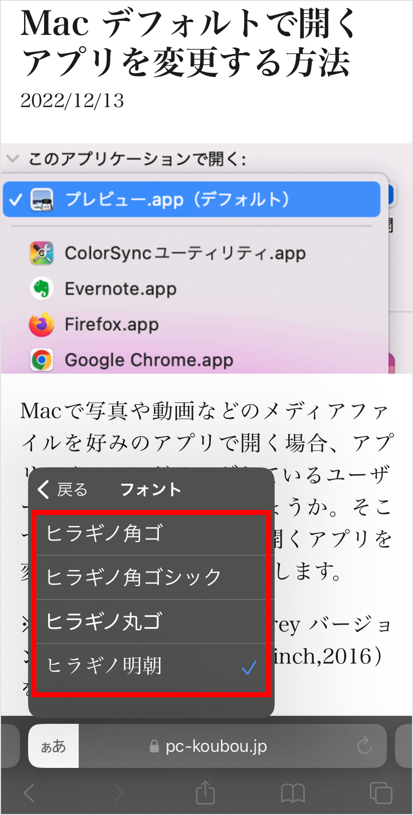 フォントはヒラギノ角ゴ、ヒラギノ角ゴシック、ヒラギノ丸ゴ、ヒラギノ明朝の4種類から設定できます。