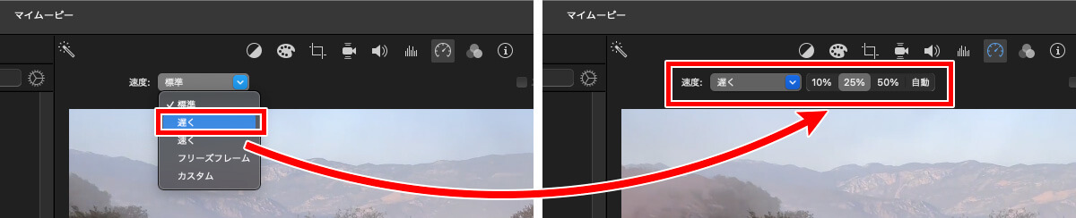 メニューから「遅く」を選択してください。今回は「25%」にしました。
