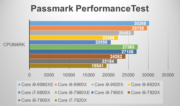 下位モデルのCore i7-9800XやCore i9-9820Xではコア数/スレッド数が増加されたことから、第7世代Core X での1ランク上の性能を示すなど、大きく飛躍しました。また、上位モデルについてもCore i9-9980XEがPassmarkや3DMark Time Spyで10%以上スコアアップするなど、第9世代Core Xは第7世代Core Xから順当にパワーアップしているとみて良さそうです。