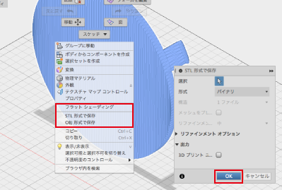 データを作成したら書き出したいボディの上で右クリックして「STL形式で保存」または「OBJ形式で保存」を選び、データを保存します。