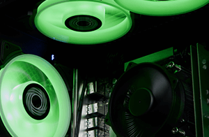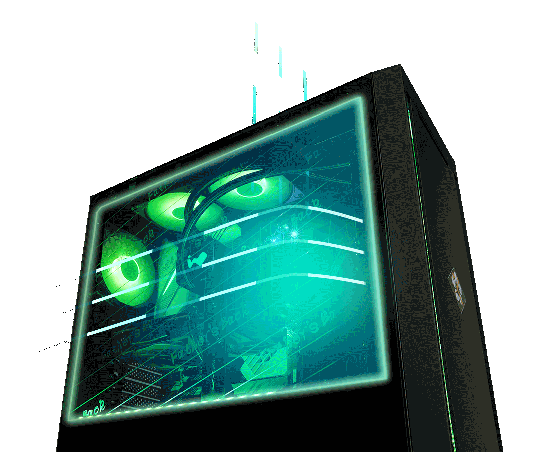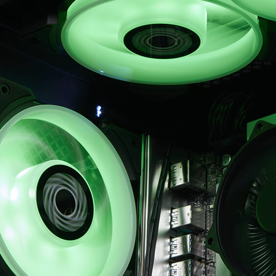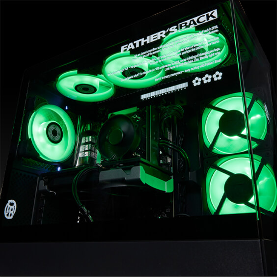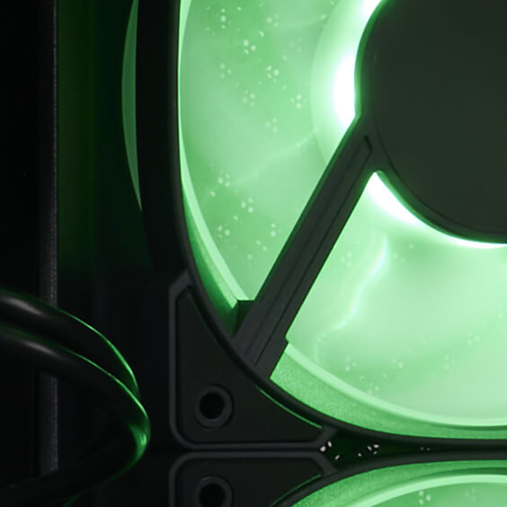 前面の水冷システム内側に最大3基、天面と背面に3基、最大6基のLEDファンを搭載し、PC本体側の設定で色の変更、LEDの消灯も可能です。
