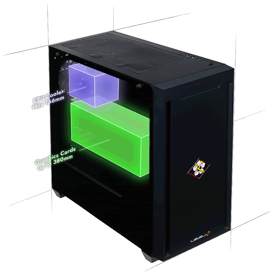 搭載可能なグラフィックスカードは最長380mm、CPU クーラーは高さ166mmまで対応。内部ドライブベイは、3.5/2.5インチ×2基、2.5インチ×2基、さらにスリム型の光学ドライブ用ベイも備わった拡張性充分の最新設計。
