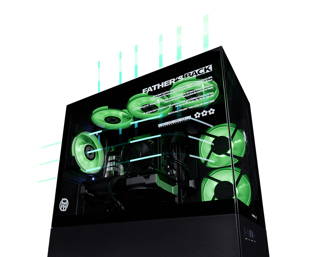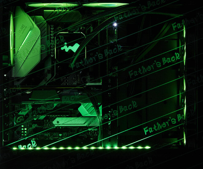 LED光をバックにオリジナルデザインのFATHER’S BACKデザインが楽しめる強化ガラスパネルを左側面に採用。