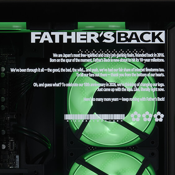 フロントと正面右サイドに父ノ背中ロゴ、正面左のガラス面には透過インクでオリジナルデザインをプリントした「父ノ背中 LEVEL∞ コラボゲーミングPC オリジナルデザインモデル」