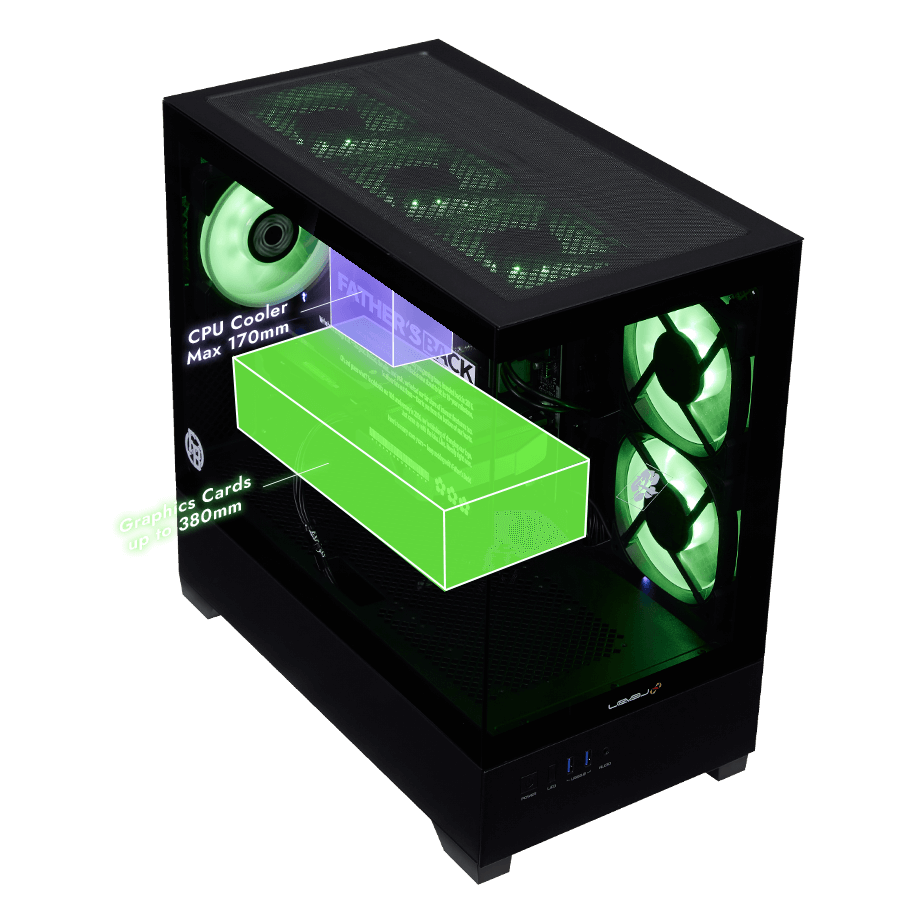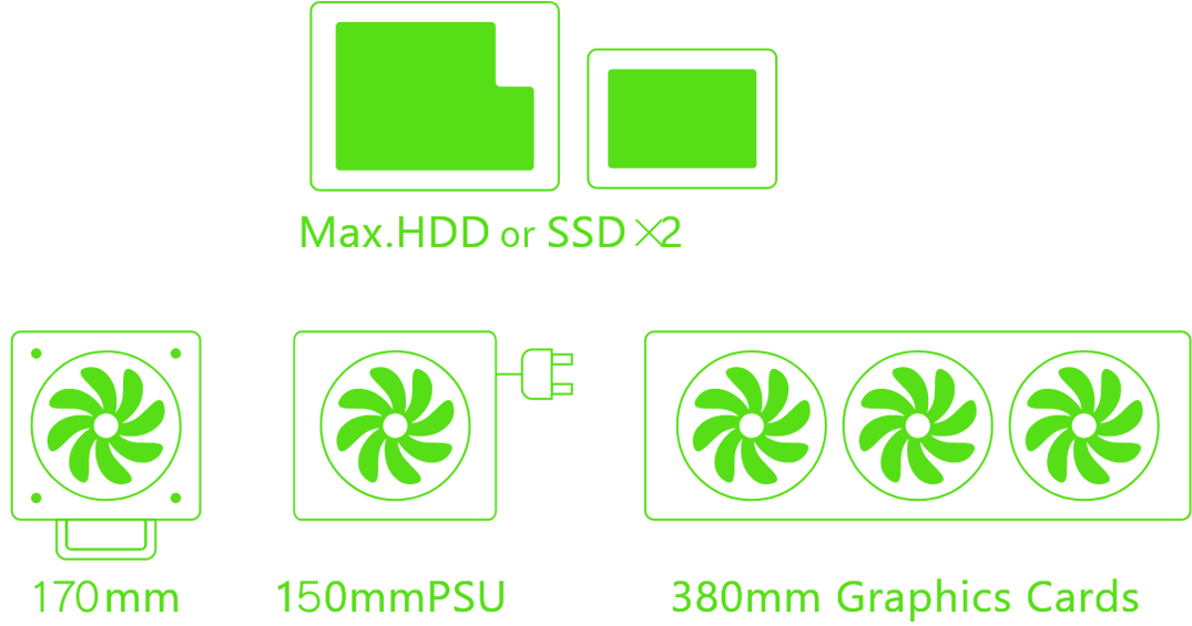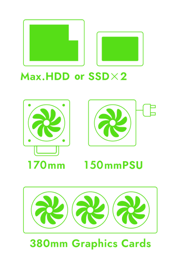 搭載可能なグラフィックスカードは最長380mm、CPU クーラーは高さ170mmまで対応。内部ドライブベイは、3.5/2.5インチ×2基搭載可能。